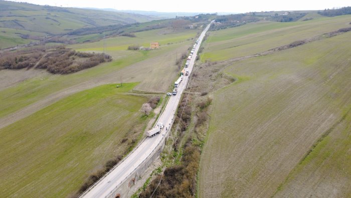Un mezzo pesante di traverso sulla carreggiata ed è blocco totale a "Ponte Gonnella". Il senso unico alternato sta diventando una vera e propria odissea per gli automobilisti in transito e anche ad altissimo rischio. La foto è dell'attento e prezioso reporter della Valle del Cervaro Antonello Granato.