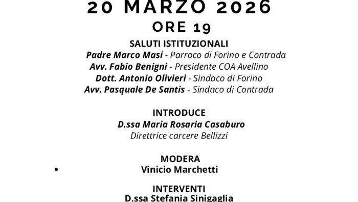 L’incontro sarà aperto dai saluti istituzionali del Sindaco del Comune di Forino, Antonio Olivieri e il sindaco di Contrada, Pasquale De Sanctis, dell’ Avvocato Fabio Benigni, Presidente del Consiglio dell’ Ordine degli avvocati di Avellino e del parroco di Forino-Contrada, Padre Marco Masi. Introdice i lavori la dottoressa Maria Rosaria Casaburo, direttrice del Carcere di Bellizzi Irpino. Interverranno: la dottoressa Stefania Sinigaglia direttrice del consultorio Familiare Spazio Famiglia Nina Moscati di Napoli, il comandante Tiziana Perillo, primo dirigente e responsabile delle Pari Opportunità della Polizia Penitenziaria. L’iniziativa rappresenta un’occasione formativa di grande valore, che intende avvicinare le nuove generazioni al tema della parità non solo come diritto, ma come dovere civico e responsabilità collettiva. Ai partecipanti saranno riconosciuti 3 crediti formativi.