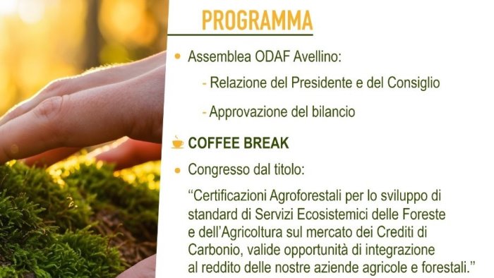 Si terrà a Monteforte Irpino l’assemblea dell’ordine dei dottori agronomi e dei dottori forestali di Avellino e il congresso su "Certificazioni agroforestali per lo sviluppo di standard di servizi ecosistemici delle foreste e dell’agricoltura sul mercato dei crediti di carbonio, valide opportunità di integrazione al reddito delle nostre aziende agricole e forestali".