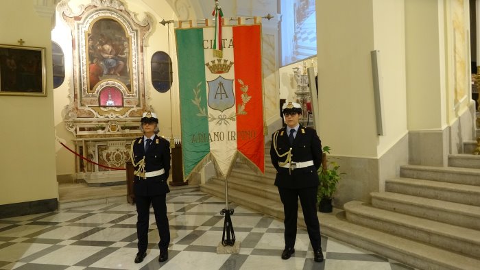 Presenti il sindaco Enrico Franza, il vice Grazia Vallone, l'assessore Toni La Braca e tra le forze dell'ordine il comandante della stazione dei carabinieri di Ariano Irpino, luogotenente Francesco Russo e della polizia municipale, colonnello Angelo Bruno. Picchetto d'onore in alta uniforme con due vigilesse, schierate ai due lati del gonfalone della città.
