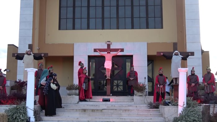 Quella appena trascorsa è stata una domenica delle palme particolarmente intensa e partecipata. Dalla processione mattutina con il coinvolgimento dei bambini alla suggestiva Via Crucis vivente sul sagrato della chiesa madre. Un momento forte, davvero molto intenso, commovente e coinvolgente soprattutto nelle scene finali della crocifissione e resurrezione di Cristo. Il freddo pungente non ha scoraggiato gli attori protagonisti di questo straordinario evento e le tante persone di ogni età presenti in piazza. Un applauso interminabile tra lacrime di gioia e abbracci, dopo un'intensa preparazione, culminata con un grande successo anche quest'anno.