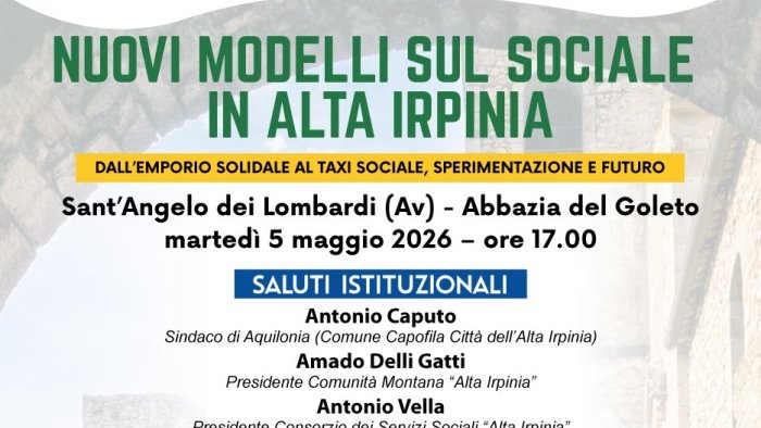 Dall’emporio solidale al taxi sociale, passando per le altre nuove buone prassi del territorio altirpino, si discuterà delle recenti iniziative messe in campo dalla Città dell’Alta Irpinia e da altri enti pubblici e privati. L’appuntamento è previsto presso l’Abbazia del Goleto di Sant’Angelo dei Lombardi alle ore 17.00.