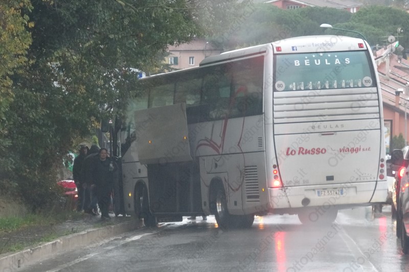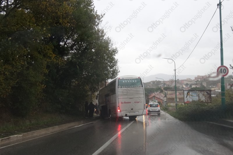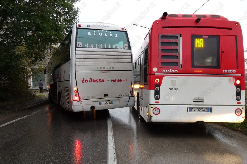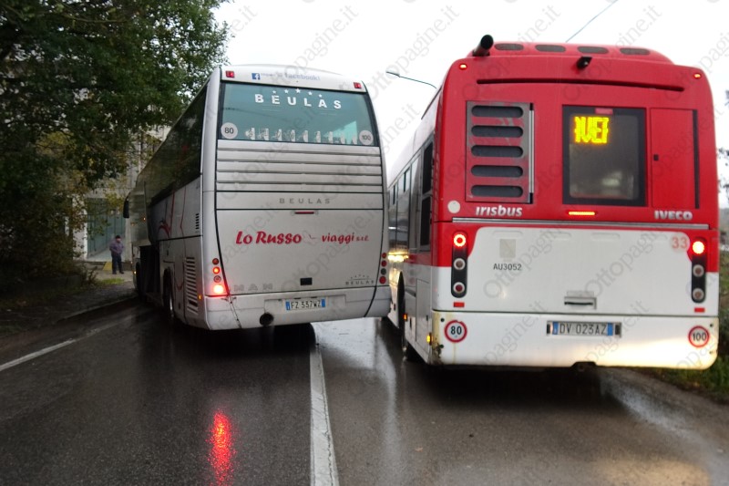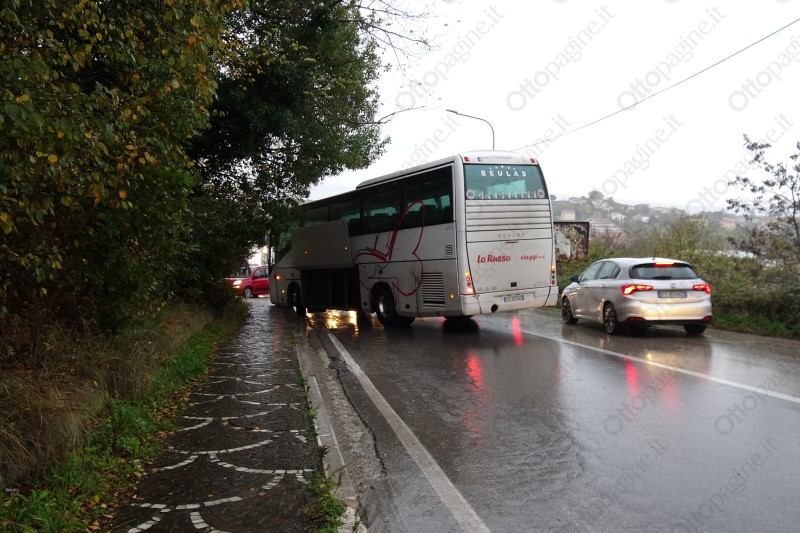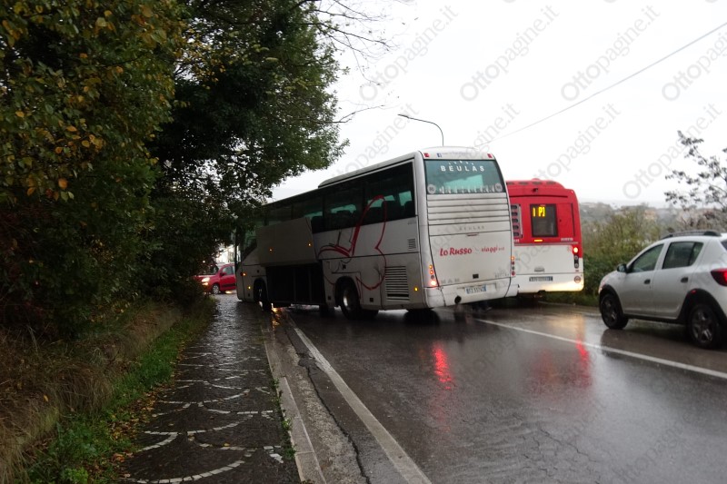 Pullman evita impatto con auto in fase di sorpasso e finisce fuori strada