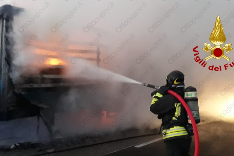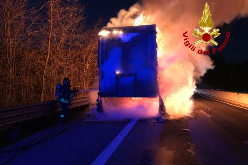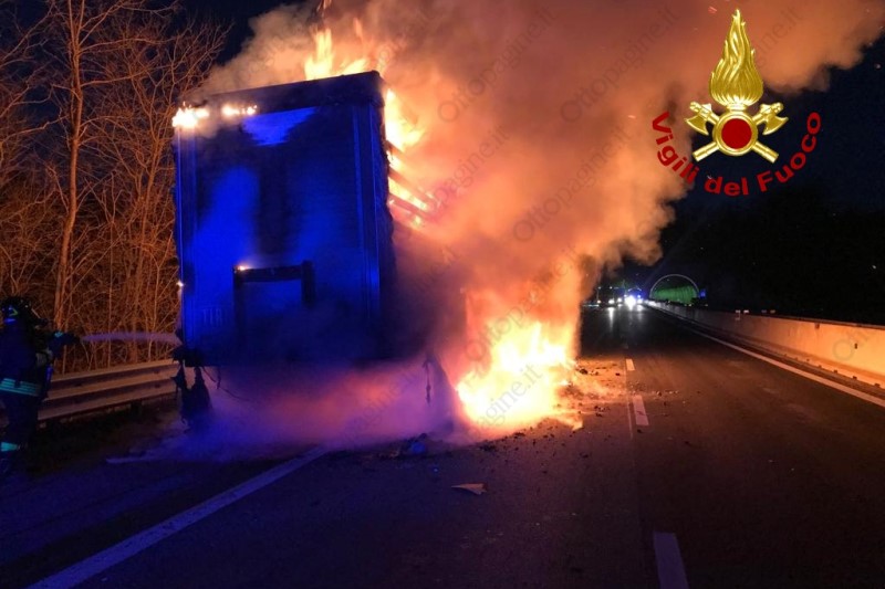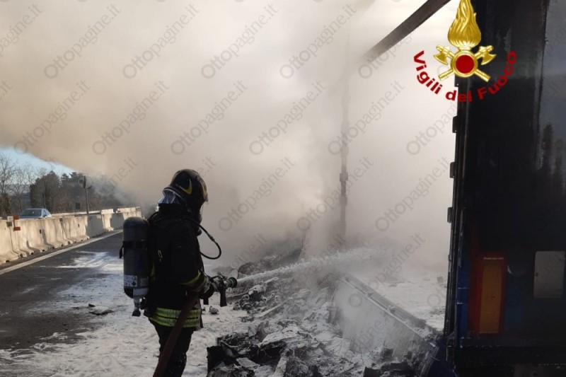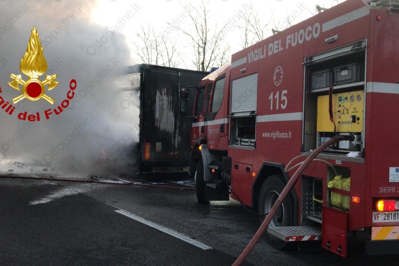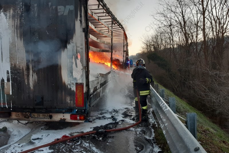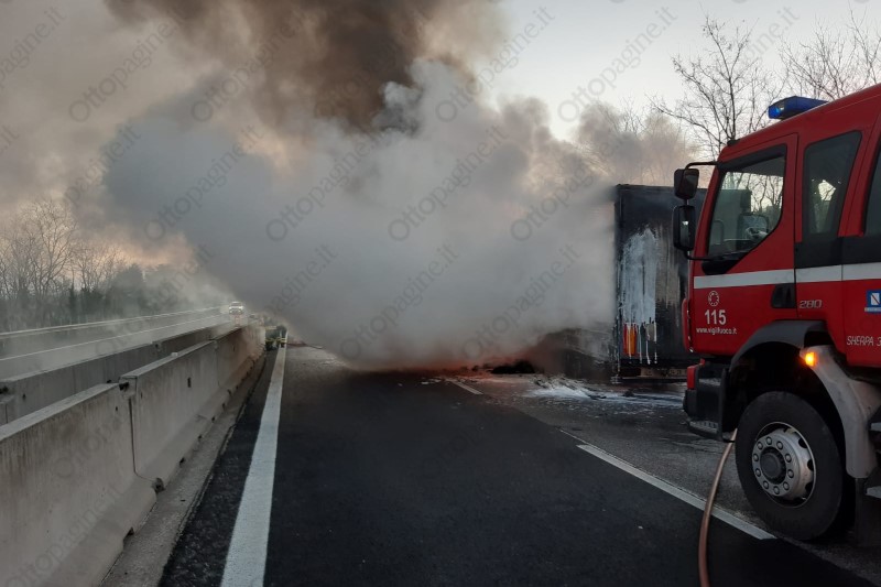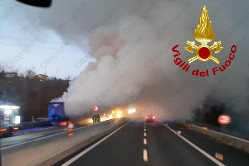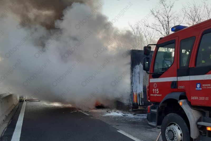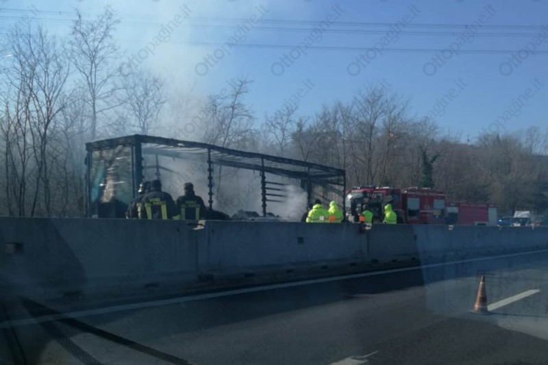 Autoarticolato in fiamme in autostrada, traffico in tilt