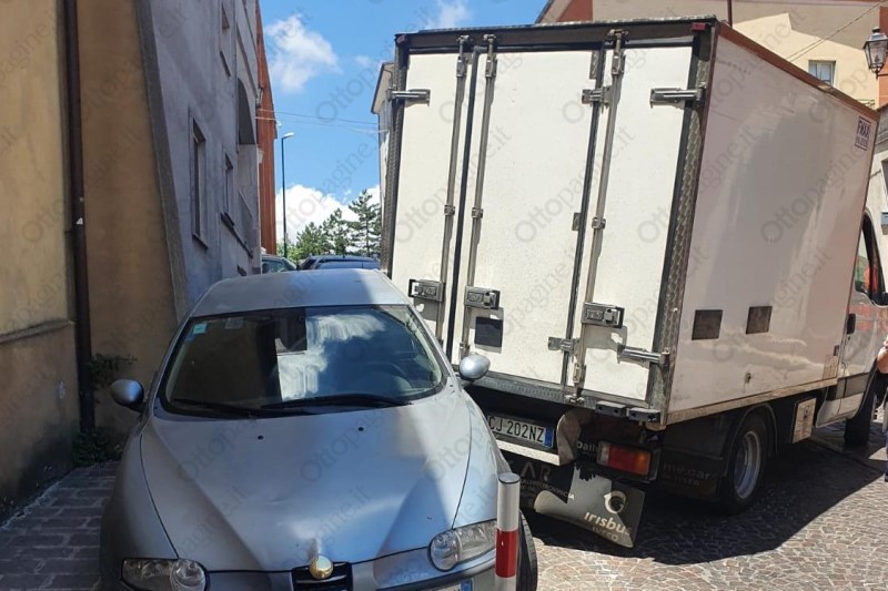 Autocarro senza conducente si schianta contro un'auto in sosta