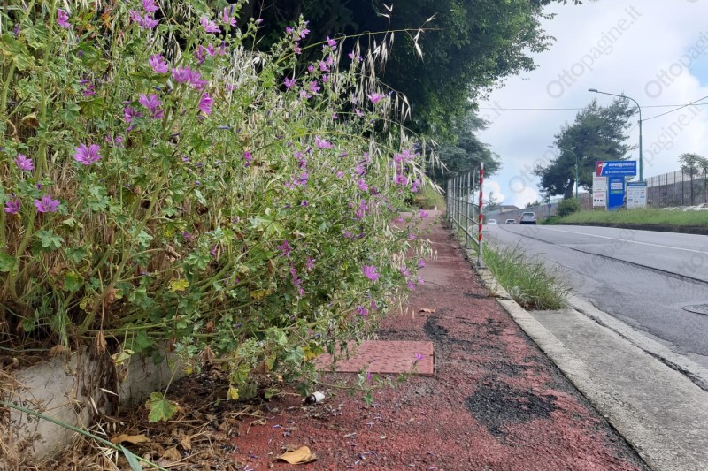 Passerella marciapiedi ostacolata da erbacce ad Ariano