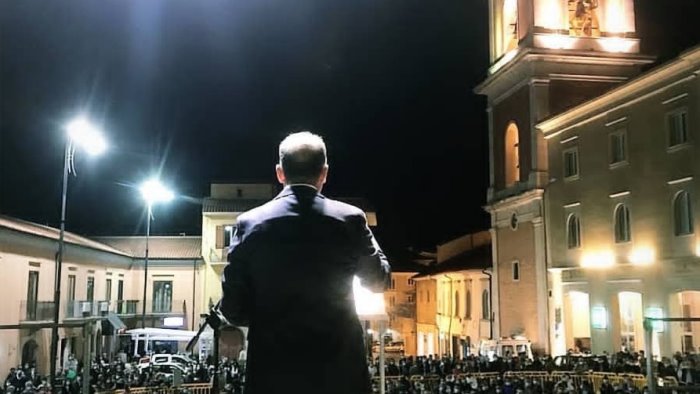 dalla scena: «Con semplicità ed umiltà, senza le luci riservate ai grandi, che di grande poi resta solo la scena, vi chiedo un po’ di attenzione, perché solo insieme possiamo riportare la luce ad una città lasciata al buio nei momenti più difficili. Rialziamoci!».