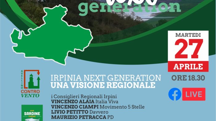 Con l’incontro che si svolgerà martedì 27 aprile alle 18.30 in diretta Facebook con i consiglieri regionali irpini, si concluderà il ciclo di appuntamenti che le associazioni “Controvento”, “Avellino Prende Parte” e “Sardine d’Irpinia” hanno avviato sui temi del Next generation Eu nella provincia di Avellino. Martedì 27 il documento “Nuove Idee per l’Irpinia” sarà al centro della discussione che i rappresentanti delle tre associazioni terranno con Vincenzo Alaia, Vincenzo Ciampi, Livio Petitto e Maurizio Petracca.