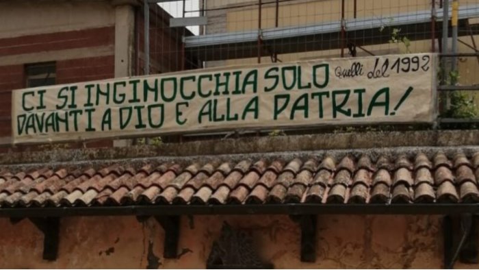 Anche il senatore di Fratelli d'Italia Antonio Iannone interviene sulla vicenda ed esprime "stupore per i rapidi interventi, arrivati,affinché si rimuovesse, prontamente, la scritta. Sosteniamo,in certezza, che non c'è nulla di esecrabile in ciò che si è esposto e che solo la sinistra antidemocratica riesce a spendere più parole che energie per tale tipo di contenuto - dichiara Iannone - Pertanto condannando fermamente qualsiasi tipo di censure in merito, continuiamo a considerare, con onore ed orgoglio, che i valori di Dio e della Patria sono e saranno ideali fondamentali per noi e per tutte le persone libere"