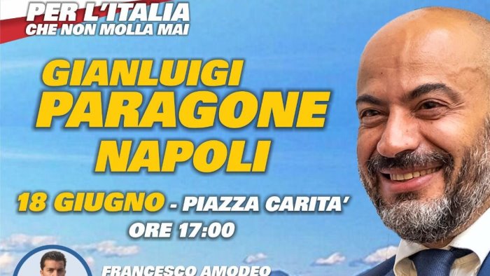 Sabato 18 Giugno alle ore 17 si terrà a Napoli, in piazza Carità, una manifestazione regionale di Italexit con la partecipazione dei Senatori Gianluigi Paragone, William De Vecchis e della Deputata Jessica Costanzo. Alla manifestazione interverrà il Coordinamento Provinciale di Italexit di Avellino che si è particolarmente impegnato per questo evento. Saranno pertanto presenti numerosi iscritti di Avellino ed anche i consiglieri comunali irpini che di recente hanno aderito ad Italexit.