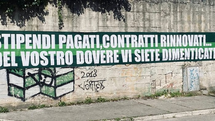 "Stipendi pagati, contratti rinnovati... del vostro dovere vi siete dimenticati": striscione all'esterno della porta carraia dello stadio "Partenio-Lombardi. I tifosi biancoverdi si sono espressi così sul momento in casa Avellino verso i playoff chiamando in causa direttamente la squadra e lo staff tecnico, impegnati nel ritiro di Mercogliano e in attesa di scoprire la prossima avversaria per il match d'ingresso negli spareggi promozione, in programma mercoledì.