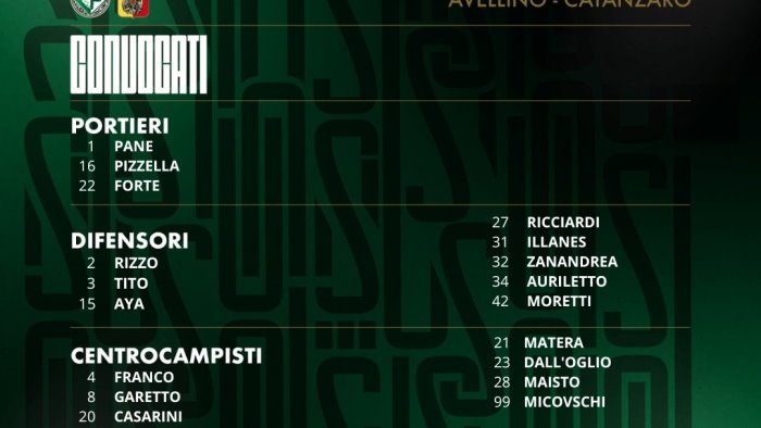 In vista del match tra Avellino e Catanzaro mister Massimo Rastelli ha diramato la seguente lista di convocati: