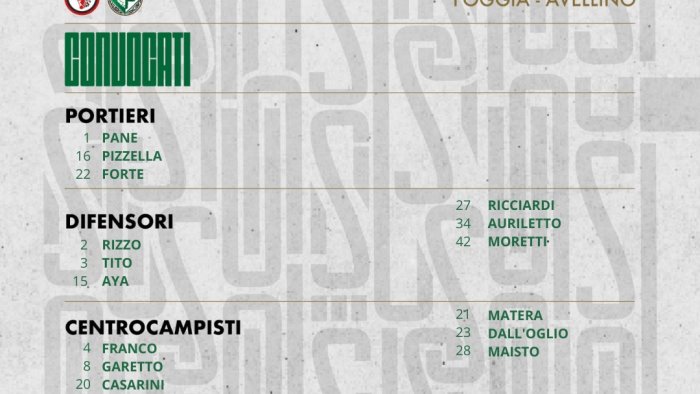 In vista del match tra Foggia ed Avellino, previsto per la dodicesima giornata del campionato di serie C, girone C, mister Massimo Rastelli ha diramato la seguente lista di convocati: