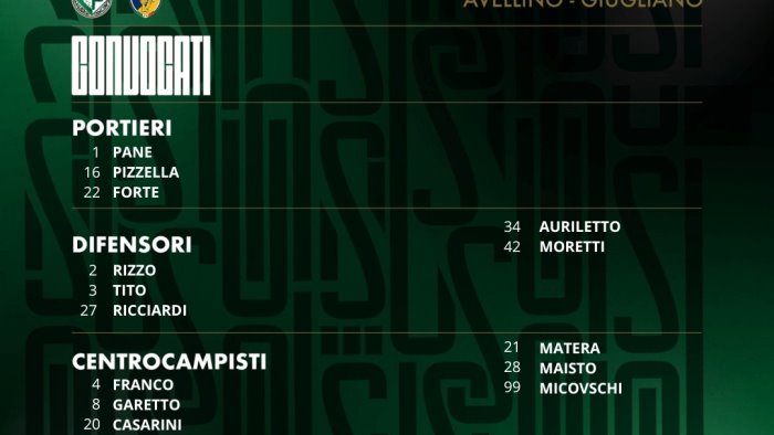 In vista del match tra Avellino e Giugliano, previsto per la tredicesima giornata del campionato di serie C, girone C, mister Massimo Rastelli ha diramato la seguente lista di convocati: