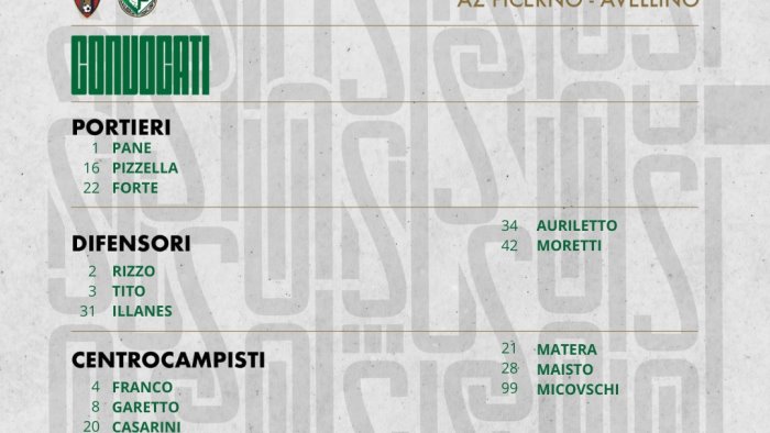 In vista del match tra Picerno ed Avellino, previsto per la quattordicesima giornata del campionato di serie C, girone C, mister Massimo Rastelli ha diramato la seguente lista di convocati: