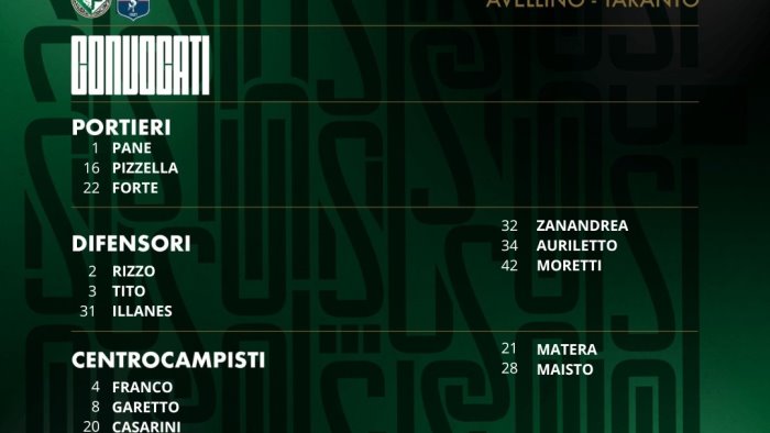 In vista del match tra Avellino e Taranto, previsto per la quindicesima giornata del campionato di serie C, girone C, mister Massimo Rastelli ha diramato la seguente lista di convocati: