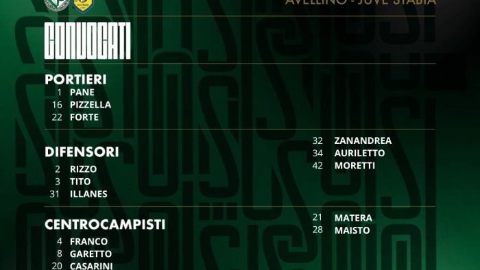 In vista del match tra Avellino e Juve Stabia, previsto per la sedicesima giornata del campionato di serie C, girone C, mister Massimo Rastelli ha diramato la seguente lista di convocati: