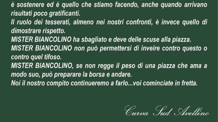 Fischi dagli spalti del "Partenio-Lombardi" al termine di Avellino-Frosinone 1-3 e le telecamere di DAZN hanno ripreso un confronto a distanza tra Raffaele Biancolino e un tifoso in Tribuna Montevergine. Il labiale, molto chiaro, del tecnico dei lupi, intento in quei secondi a raggiungere con la squadra e lo staff l'anello inferiore della Curva Sud, è rimbalzato sui social e nelle scorse ore il tifoso organizzato biancoverde ha emesso un comunicato in riferimento a quanto accaduto ieri sera. "Ci sono limiti invalicabili e gerarchie che non possono non essere rispettate. Il tifoso, a casa nostra, è al primo posto. Il tifoso macina chilometri, paga il biglietto di tasca propria, gioisce e soffre. Il tifoso applaude ai gol e fischia ai passaggi sbagliati perché il pallone è il gioco popolare per eccellenza. - si legge nel comunicato della Curva Sud Avellino - Quello che abbiamo visto ieri è inaccettabile perché chi manca di rispetto a uno solo dei tifosi dell'Avellino, manca di rispetto a tutta la piazza. Come curva non ci addentriamo in commenti sul calcio giocato, né è nostro ruolo commentare questa o quella scelta tecnica. Il nostro ruolo è sostenere ed è quello che stiamo facendo, anche quando arrivano risultati poco gratificanti. Il ruolo dei tesserati, almeno nei nostri confronti, è invece quello di dimostrare rispetto. Mister Biancolino ha sbaglaito e deve delle scuse alla piazza. Mister Biancolino non può permettersi di inveire contro questo o contro quel tifoso. Mister Biancolino, se non regge il peso di una piazza che ama a modo suo, può preparare la borsa e andare. Noi il nostro compito continueremo a farlo... voi cominciate in fretta".