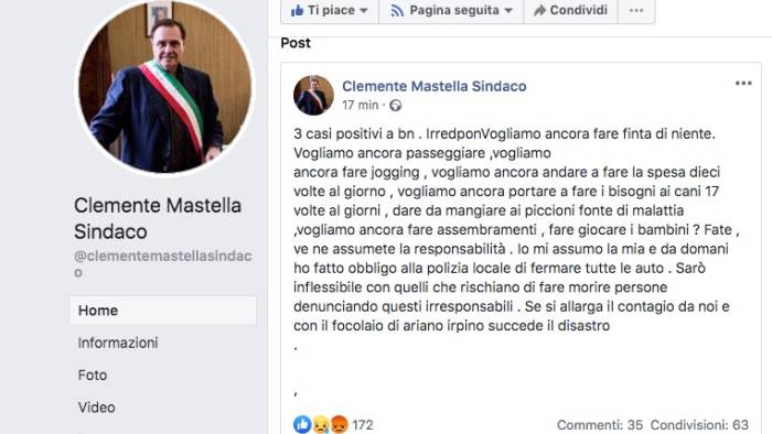 “Vogliamo ancora fare assembramenti e fare giocare i bambini? Fate, ve ne assumete la responsabilità” tuona ancora Mastella che poi annuncia: “Io mi assumo la mia e da domani ho fatto obbligo alla polizia locale di fermare tutte le auto. Sarò inflessibile con quelli che rischiano di fare morire persone denunciando questi irresponsabili. Se si allarga il contagio da noi e con il focolaio di ariano irpino succede il disastro”.