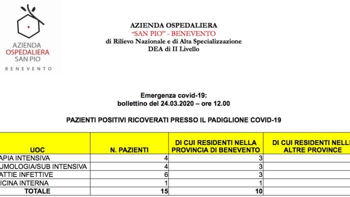 Quindici pazienti positivi al Covid19 ricoverati all'Ospedale San Pio di Benevento. Sono i numeri comunicati dal bollettino di oggi (aggiornato alle 12) dal nosocomio sannita.