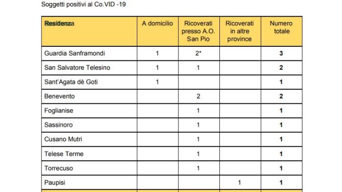 | Residenza | A domicilio | Ricoverati al San Pio | Ricoverati in altre province | totale |