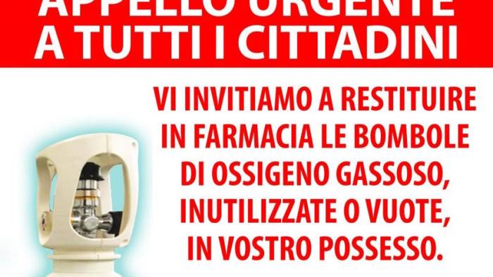 Da questa mattina sul sito dell'Asl di Benevento in prima pagina campeggia un appello urgente rivolto a tutti i cittadini. La locandina recita: “vi invitiamo a restituire in farmacia le bombole di ossigeno gassoso inutilizzate o vuote in vostro possesso”.