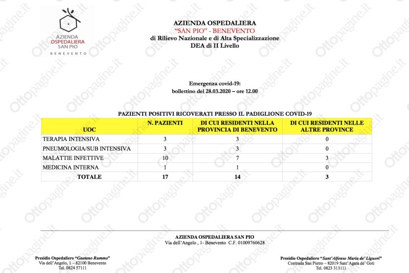 Dall'ospedale San Pio, invece, comunicano di avere ricoverati 17 pazienti positivi al Covid19 (14 della provincia di Benevento, 3 di altre province). Tre di loro sono in terapia intensiva, altri 3 nel reparto di pneumologia / sub intensiva; 10 ricoverati nel reparto di malattie infettive, 1 nel reparto di medicina interna.
