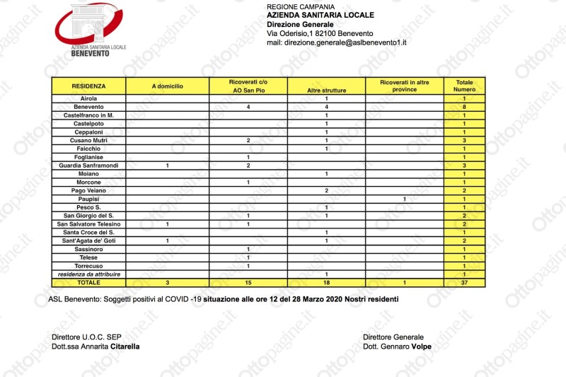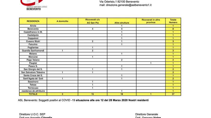 Trentasette contagiati da Covid 19 nel Sannio. Sono i numeri diffusi dall'ultimo bollettino dell'Azienda Sanitaria Locale di Benevento che fotografano la situazione alle ore 12 di oggi.