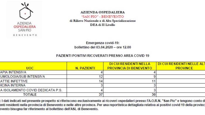 Il resoconto del nosocomio sannita alle 12 di oggi indica la presenza di 30 pazienti della provincia di Benevento e 7 provenienti da altre province.
