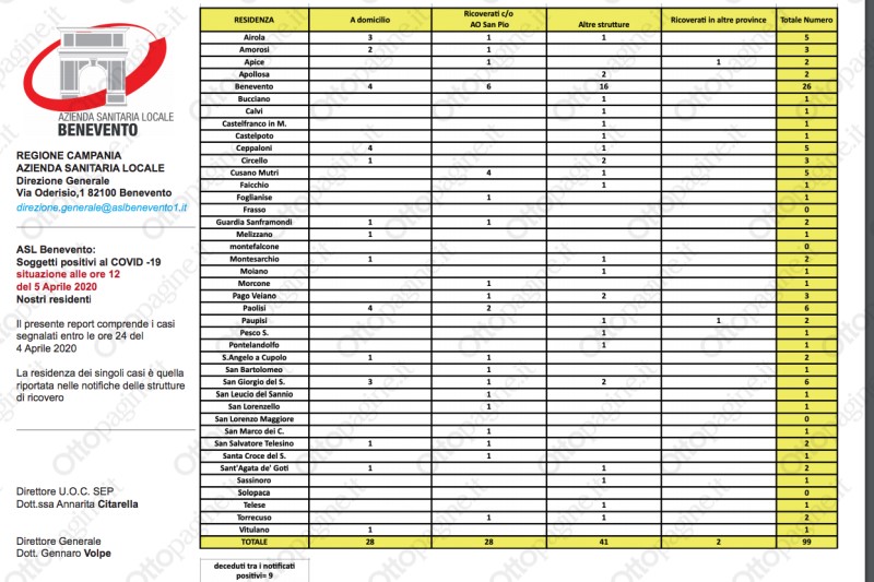 Ventidue nuovi positivi, 2 già accertati e 25 negativi: sono gli esiti degli ultimi 49 tamponi effettuati a domicilio dal personale del Servizio di Epidemiologia e Prevenzione (Sep) dell’Asl Benevento. Il dato relativo alle positività alla SARS-CoV-2 interessa per la maggior parte (18 casi su 22) dipendenti del centro di riabilitazione “Villa Margherita” in sorveglianza sanitaria obbligatoria domiciliare. Salgono dunque a 99 le persone residenti in provincia di Benevento risultate contagiate.