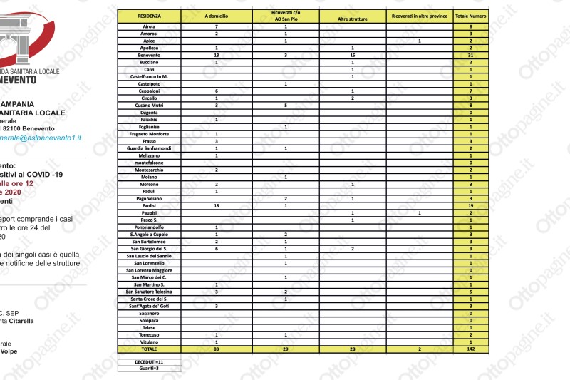 Nove i casi a San Giorgio del Sannio, 8 ad Airola e Cusano Mutri, 7 a Ceppaloni e 5 a San Salvatore Telesino. Tre i casi registrati nei comuni: Amorosi, Circello, Frasso Telesino, Morcone, Pago Veiano, Sant'Angelo a Cupolo, San Bartolomeo, Sant'Agata de' Goti.