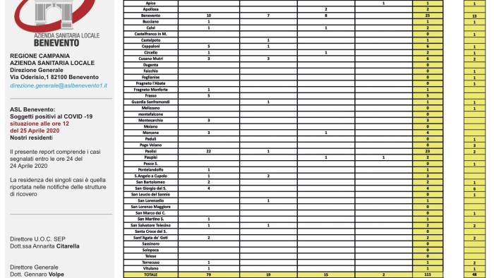 Scende a 115 unità il numero dei contagi nel Sannio, mentre sono 48 le guarigioni. Sono questi i dati del report elaborato dal Servizio Epidemiologia dell’Asl di Benevento oggi, sabato 25 aprile. Di questi 19 sono ricoverati presso l'azienda ospedaliera San Pio, 15 in altre strutture, 2 sono ricoverati fuori provincia mentre sono 79 le persone che stanno affrontando la malattia presso il proprio domicilio.