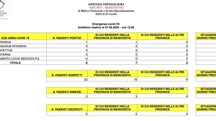 Sono 9 i pazienti ricoverati nei reparti Covid dell'azienda ospedaliera San Pio di Benevento. 7 residenti nel Sannio, 2 arrivati da altre province. Un numero in forte decremento grazie ai tre pazienti dimessi questa mattina, 5 nelle ultime 24 ore. Un dato positivo nonostante ieri il numero dei contagiati sia aumentato di una sola unità con un tampone positivo.
