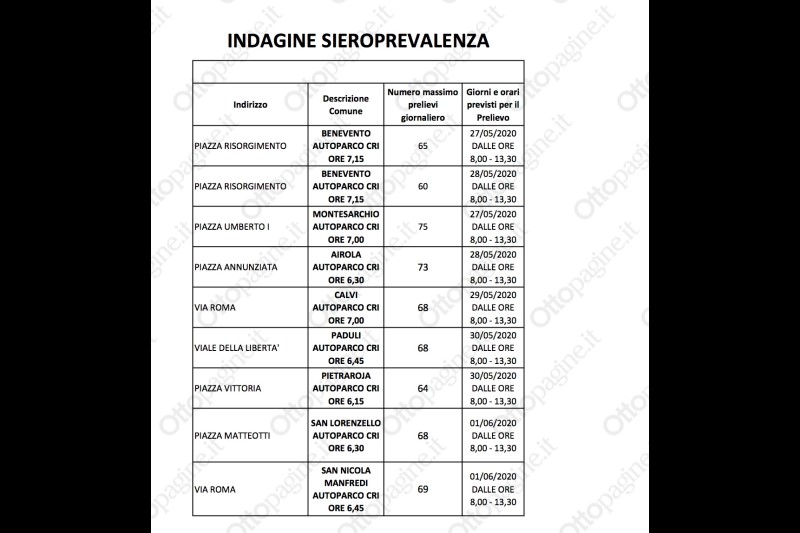 Partirà domani mattina da piazza Risorgimento a Benevento l'indagine sierologica voluta da Istat, ministero della Salute e Regione e condotta dai volontari della Croce Rossa.