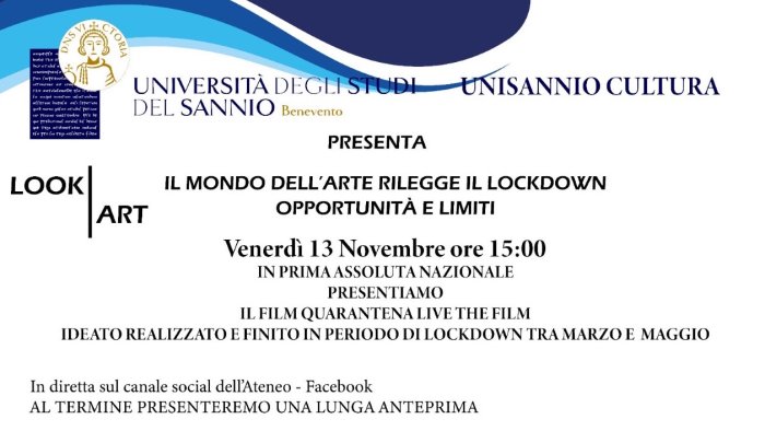 Si terrà venerdì 13 novembre, alle 15, nell’ambito del progetto di Ateneo, Unisannio Cultura, l’evento: “Look-Art. Il mondo dell’arte durante il lockdown. Opportunità e limiti”, incontro live interamente in diretta sul profilo Facebook dell’Università degli Studi del Sannio. L’appuntamento rappresenta, di fatto, l’anteprima nazionale del film “Quarantena Live The Film”, pellicola ideata, realizzata e completata nel periodo del lockdown, tra marzo e maggio 2020, per la regia di Giuseppe Aquino, importante interprete dell’audiovisivo nel nostro Paese. Il film, inviato in selezione alla 77esima Mostra Internazionale del Cinema di Venezia ha, di fatto, consegnato al cinema italiano tre record, tra cui, quello di sancire un metodo di realizzazione cinematografica unica nel panorama mondiale.