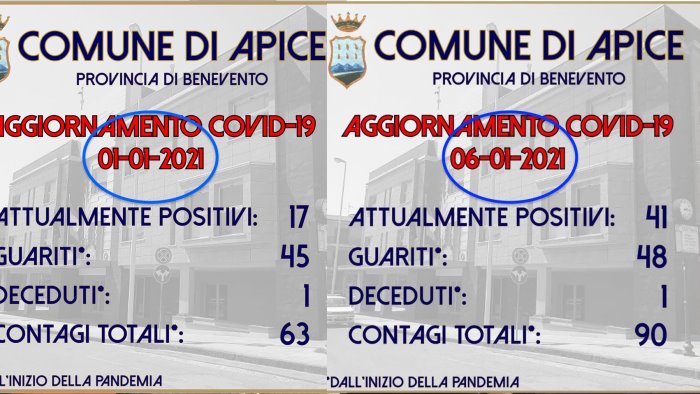 Il primo incremento si era però registrato dal 24 dicembre (11 contagiati totali) al 29 dicembre quando invece i positivi residenti nel territorio apicese erano diventati 17. Poi con il passare dei giorni il costante aumento fino a raggiungere la quota di ieri di 41 contagi. Una situazione costantemente monitorata dall'Asl e dal sindaco Angelo Pepe che ieri in un post aveva dato notizia degli ultimi due contagi: “Da comunicazione ASL si apprende della positività di due cittadini al SARS-CoV-2. Inoltre un cittadino ha comunicato la positività al tampone rapido (antigenico) e resta, pertanto, in attesa del tampone molecolare a cura dell'ASL rispettando l'isolamento fiduciario”.