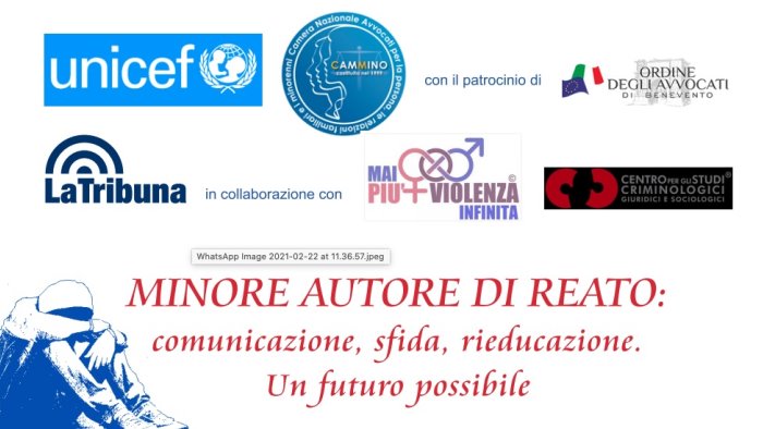 “Minore autore di reato: comunicazione, sfida, rieducazione. Un futuro possibile” è il titolo del webinar che si terrà mercoledì 24 febbraio dalle ore 15 alle 18, organizzato da Cammino (Camera Nazionale Avvocati per la persona, le relazioni familiari e i minorenni) e dal Comitato Provinciale Unicef di Benevento, con il patrocinio dell’ordine degli avvocati di Benevento e la Tribuna ed in collaborazione con l’associazione “Mai più violenza infinita”.