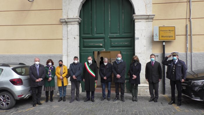 Con il primo cittadino presenti anche numerosi assessori e consiglieri comunali. Tutti insieme sotto alle bandiere a mezz'asta con un pensiero speciale per le vittime del Covid e per i loro familiari catapultati in una terribile realtà che ormai da dodici mesi è presente nella vita di ognuno.