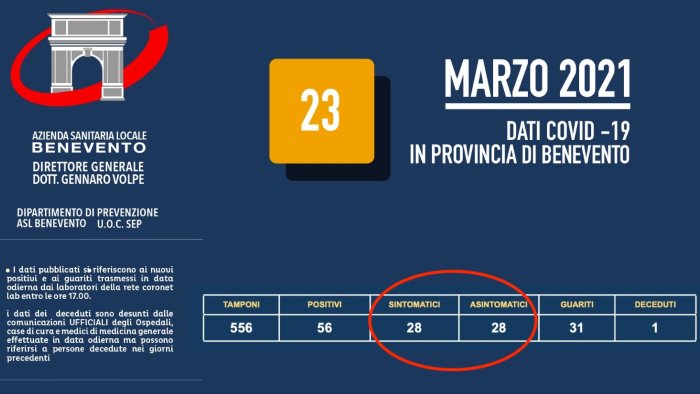 Nel Sannio è boom di nuovi positivi che purtroppo hanno sintomi a causa del covid. Su 556 tamponi analizzati, infatti, 56 sono risultati positivi. Di questi sono 28 i sintomatici e 28 gli asintomatici. Un dato preoccupante che conferma come il virus sia cambiato, ovvero si stanno registrando più problemi di salute per chi lo contrae. Di contro, invece, sono 31 le persone dichiarate dall'aSl ufficialmente guarite. Una la vittima, deceduta al San Pio di Benevento (Leggi altro articolo).