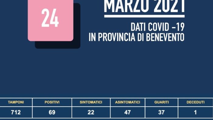 Sessantanove nuovi positivi al covid19 nel Sannio dai 712 tamponi processati dall'Asl di Benevento. Ben ventidue, tra gli infetti, manifestano sintomi del virus mentre 47 sono asintomatici. Trentasette i guariti e un decesso. Sono i numeri riportati dal quotidiano bollettino del dipartimento di prevenzione dell'azienda sanitaria locale di via Oderisio.