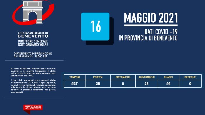 Sono 28 i nuovi positivi nel Sannio. È quanto emerge dal report giornaliero della Asl. 527 i tamponi analizzati nelle ultime 24 ore e dunque un rapporto tamponi positivi pari al cinque per cento.