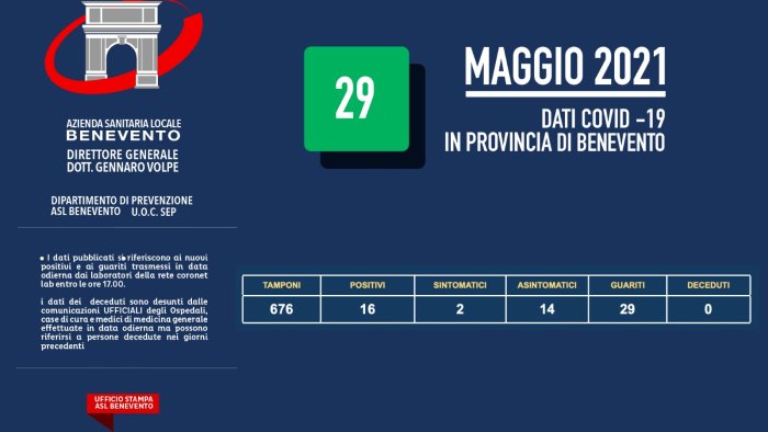 In lievissimo aumento ma è sempre un dato tutto positivo quello che emerge dai tamponi processati dall'Asl di Benevento per verificare i contagi da covid19 nel Sannio. Sedici le persone risultate infette su 676 tamponi processati.