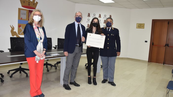 Questa mattina in Questura a Benevento si è svolta la cerimonia di consegna, da parte del questore Luigi Bonagura, degli attestati agli studenti appartenenti alle classi selezionate a livello provinciale, per la 4^ edizione del progetto / concorso “PretenDiamo legalità” per l’anno scolastico 2020/21, svolto dalla Polizia di Stato, in collaborazione con il MIUR-Ufficio Scolastico Provinciale. La giornata ha visto un primo momento nella sala riunioni della Questura, dove è stato premiato l’alunno Pellegrino Iglio della Classe II C dell’ I.C. Padre Pio di Airola, per la categoria scuola primaria, sezione Arti figurative con tecniche varie, elaborato scelto per la creatività ed originalità della tecnica compositiva, per l’efficacia e la pertinenza nella rappresentazione del tema e per l’immediatezza del messaggio, tanto da essere segnalato per la realizzazione di un manifesto. Si è proceduto poi alla consegna degli attestati agli studenti MariKa Cavuoto, Carmine Castaldi e Matteo Zullo della Classe V B – ITA “M. Vetrone” dell’I.S. “Galilei Vetrone” di Benevento, per la sezione video o spot, che hanno meritato una menzione speciale per aver realizzato un lavoro con grande e originale impegno grafico, piena aderenza al tema ed immediatezza del messaggio. Atteso il particolare momento di diffusione epidemiologica da Covid-19, si è scelto poi di spostarsi presso la Scuola Primaria “Nicola Sala” dell’I.C. “F. Torre”, dove il Vice Questore Vittorio Zampelli ha consegnato l’attestato all’intera classe III B, alla quale è andata una menzione speciale per l’elaborato di testo, con la seguente motivazione: “Il lavoro realizzato con piena aderenza al tema ed originalità realizzativa, ha regalato una storia avvincente che ha suscitato il plauso della Commissione”.
