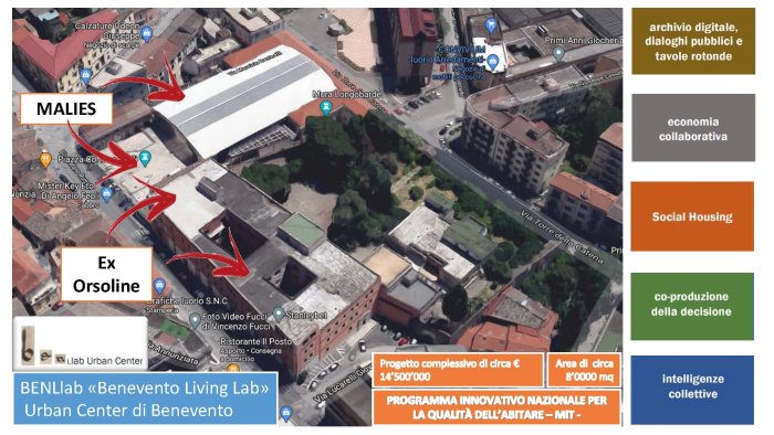 Il progetto, realizzato con la collaborazione dell’Università del Sannio, e il sostegno di Confindustria Benevento, intende riqualificare la zona del territorio del Comune di Benevento tra via Torre della Catena, via Porta Rufina e via Gaetano Rummo (per un’area di circa 8’000 mq) ed in particolare gli immobili di proprietà comunale “Ex Orsoline” e “Mercato Commestibili - Galleria Malies”, prevedendo la realizzazione di un Urban Center innovativo, creando uno spazio di incubazione di imprese ed un luogo di partecipazione e incontro attraverso la messa a disposizione e la fruizione di spazi “aperti” che stimolino la conoscenza, il dialogo e lo scambio.
