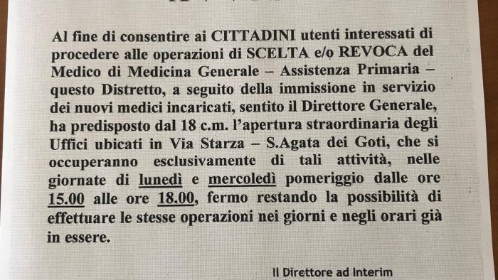 A seguito della immissione in servizio dei nuovi medici di famiglia nell’ambito del distretto di Montesarchio il Direttore Generale dell’Asl, Gennaro Volpe, con la fattiva collaborazione del Direttore del Distretto, Gelsomino Ventucci, ha disposto l’apertura straordinaria degli Uffici Asl preposti alle attività di SCELTA e REVOCA del Medico di Medicina Generale. Pertanto, in aggiunta agli orari ordinari, nelle giornate di lunedì e mercoledì, dalle ore 15.00 alle ore 18.00, i cittadini interessati, possono recarsi nella sede Asl di Via Starza a S.Agata dei Goti, ed ottenere il cambio o l’attribuzione del medico di base.