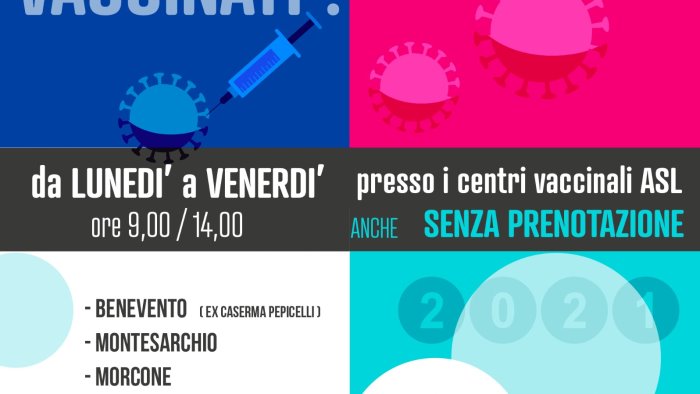 Da lunedì prossimo gli hub vaccinali saranno aperti dal lunedi al venerdi, dalle 9 alle 14. Ad annunciarlo è il direttore generale dell’Asl, Gennaro Volpe, che dichiara: “Invito nuovamente i cittadini che ancora non hanno aderito, a vaccinarsi! In particolare -continua Volpe- mi rivolgo ai giovani ed alle loro famiglie, affinchè senza indugi si rivolgano all’ hub più vicino per ottenere la vaccinazione e cominciare l’anno scolastico in sicurezza”.