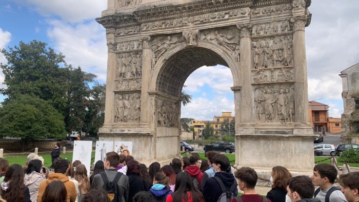 È Nemesi, secondo la professoressa Aglaia McClintock, docente di Diritto romano e diritti dell’antichità all’Università del Sannio, la dea rappresentata sulla chiave di volta posta al vertice dell’Arco di Traiano. La divinità è riprodotta in maniera identica su entrambi i lati dell’arco ed è la figura centrale o portante attorno alla quale ruota il tutto sistema virtù raffigurate nei pannelli, simbolo del regno dell’optimus princeps Traiano.