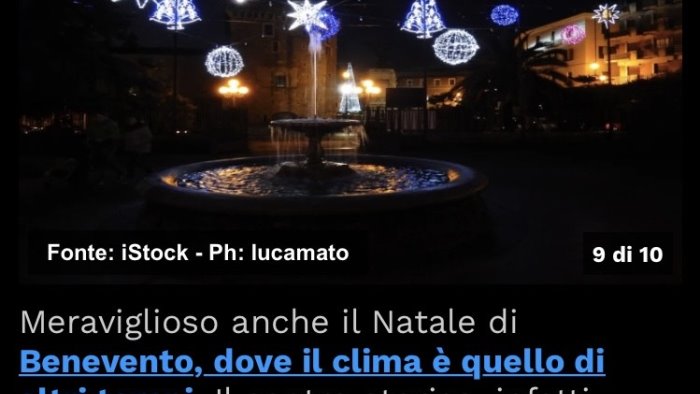 “Meraviglioso anche il Natale di Benevento, dove il clima è quello di altri tempi. Il centro storico, infatti, assume un aspetto particolarmente romantico e irresistibile. Una vera perla d'Italia che in questo periodo è più affascinante che mai” è quanto si legge nell’articolo al seguente link https://siviaggia.it/viaggi/fotonotizia/citta-europa-meno-note-passare-natale/348911/