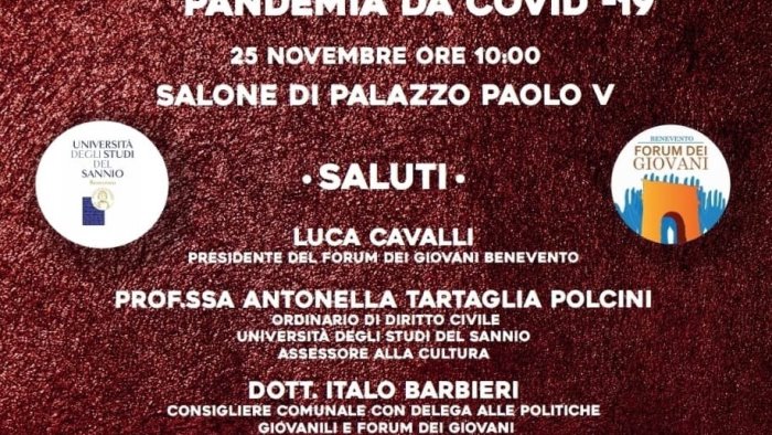 "In occasione della Giornata Internazionale per l’eliminazione della violenza contro le Donne il Forum dei Giovani di Benevento ha organizzato una iniziativa in presenza che si terrà il giorno 25 novembre alle ore 10 presso il Salone di Palazzo Paolo V, a Benevento, al fine di fare luce sugli aspetti che riguardano il fenomeno della violenza domestica.