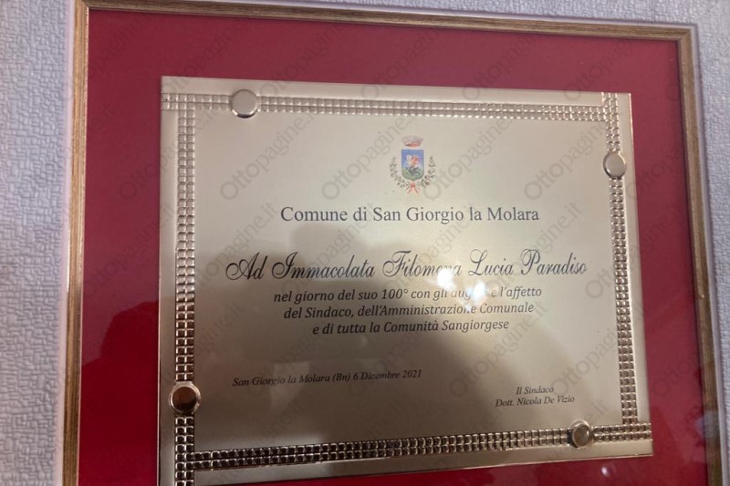 Come ogni giorno ha voluto percorrere da sola la rampa di scale che dal primo piano l'hanno portata nell'area giorno della sua casa dove da sempre ha vissuto. Oggi in quell'abitazione di contrada Fabbricata a San Giorgio la Molara si respira aria di festa. Una gioia immensa per i cento anni di Immacolata Paradiso, all'anagrafe Immacolata Filomena Lucia Paradiso. Ad attenderla nel salone allestito a festa ci sono tutti i parenti, a partire dai tre figli: Antonio, Maria e Chiara Vicario, con le rispettive famiglie. Tre figli, otto nipoti ed altrettanti pronipoti presenti per festeggiare nonna Immacolata che nella sua semplicità ha ringraziato tutti più volte.